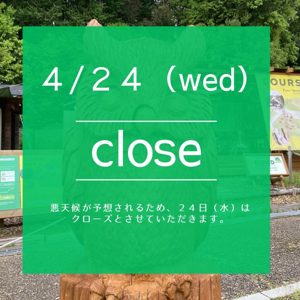 4/24(水)の営業は、悪天候が予想されるためクローズとさせていただきます。4/25(木)は、定休日のため次回の営業日は4/26(金)になります。 ご了承のほどよろしくお願いいたします。 [フォレストアドベンチャー新城のご予約](お電話)090-7033-0446(WEB予約)https://shinshiro-fa.urkt.in/ja/direct/offices/296/courses -