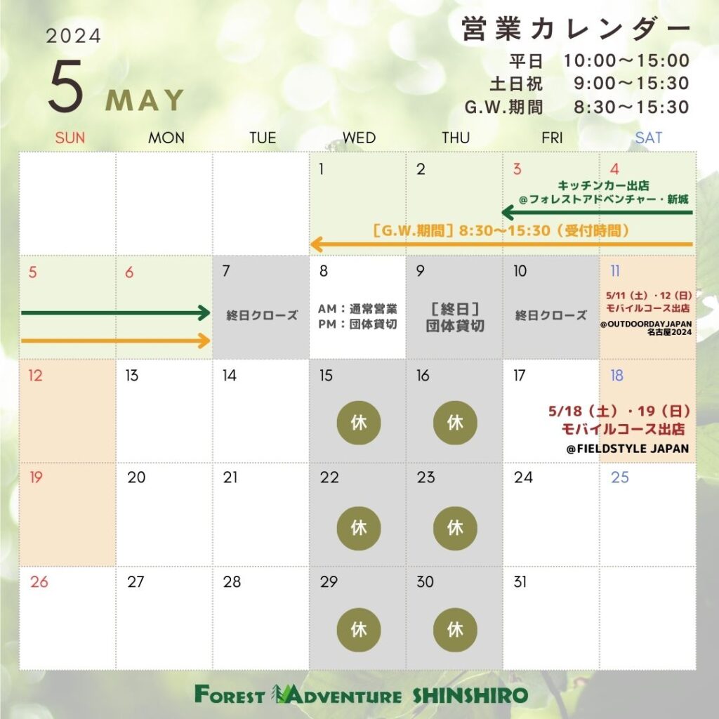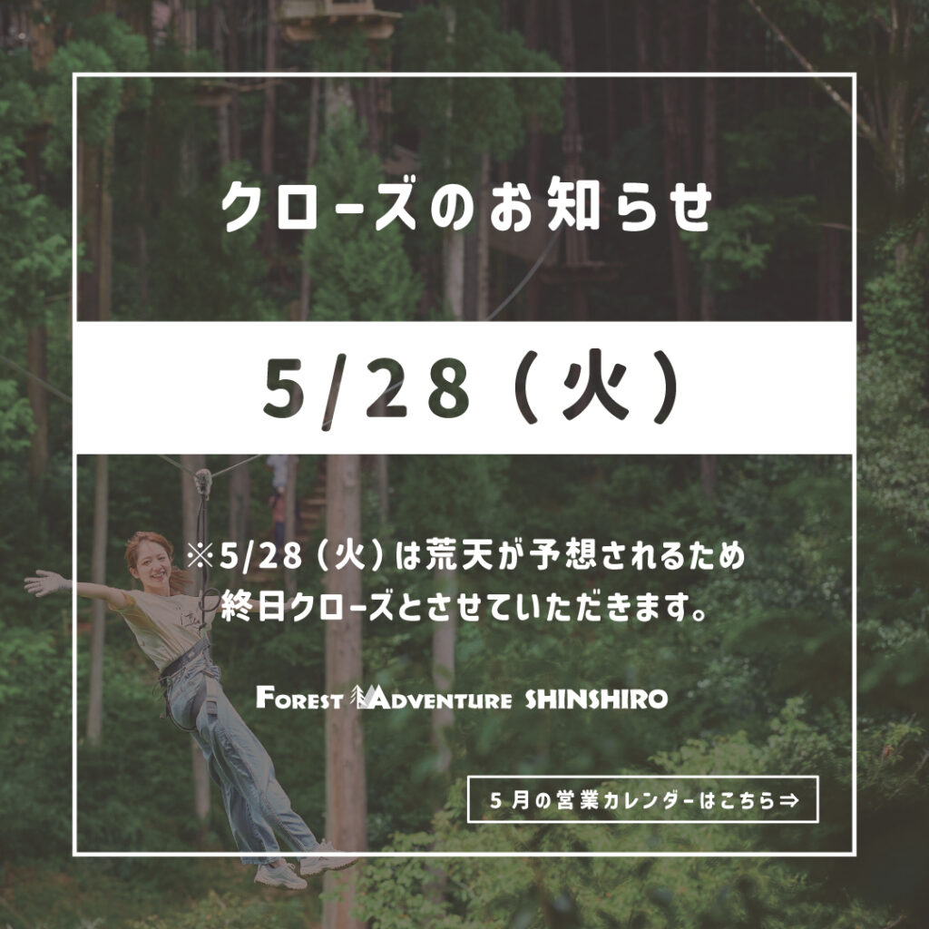 5/13(月)の営業は、悪天候が予想されるためクローズとさせていただきます。ご検討いただいておりました皆様には大変ご迷惑をお掛けいたしますが、ご了承のほどよろしくお願いいたします。 [フォレストアドベンチャー新城のご予約](お電話)090-7033-0446(WEB予約)https://shinshiro-fa.urkt.in/ja/direct/offices/296/courses -