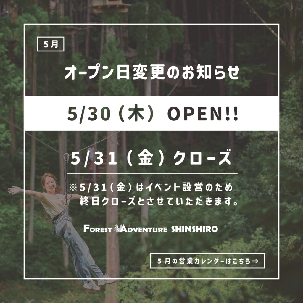 5/30(木)はオープンとさせていただきます。今のところお天気も良さそうですので、ぜひ遊びにいらしてください。 また、5/31(金)はイベント設営のため終日クローズとさせていただきます。ご検討いただいておりました皆様には大変ご迷惑をお掛けいたしますが、何卒ご了承のほど、よろしくお願いいたします。 👉フォレストアドベンチャー新城... -