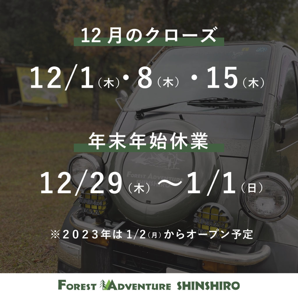 フォレストアドベンチャー・新城です。 12月はクローズ日がございます。 ご迷惑をおかけいたしますが、ご了承のほど宜しくお願いいたします。 【クローズ】 ・12月1日(木) ・12月8日(木) ・12月15日(木) 【年末年始のクローズ】 ・2022年12月29日(木)〜31(土) ・2023年1月1日(日) ※2023年は1月2日からオープン予定です。ご予約を... -