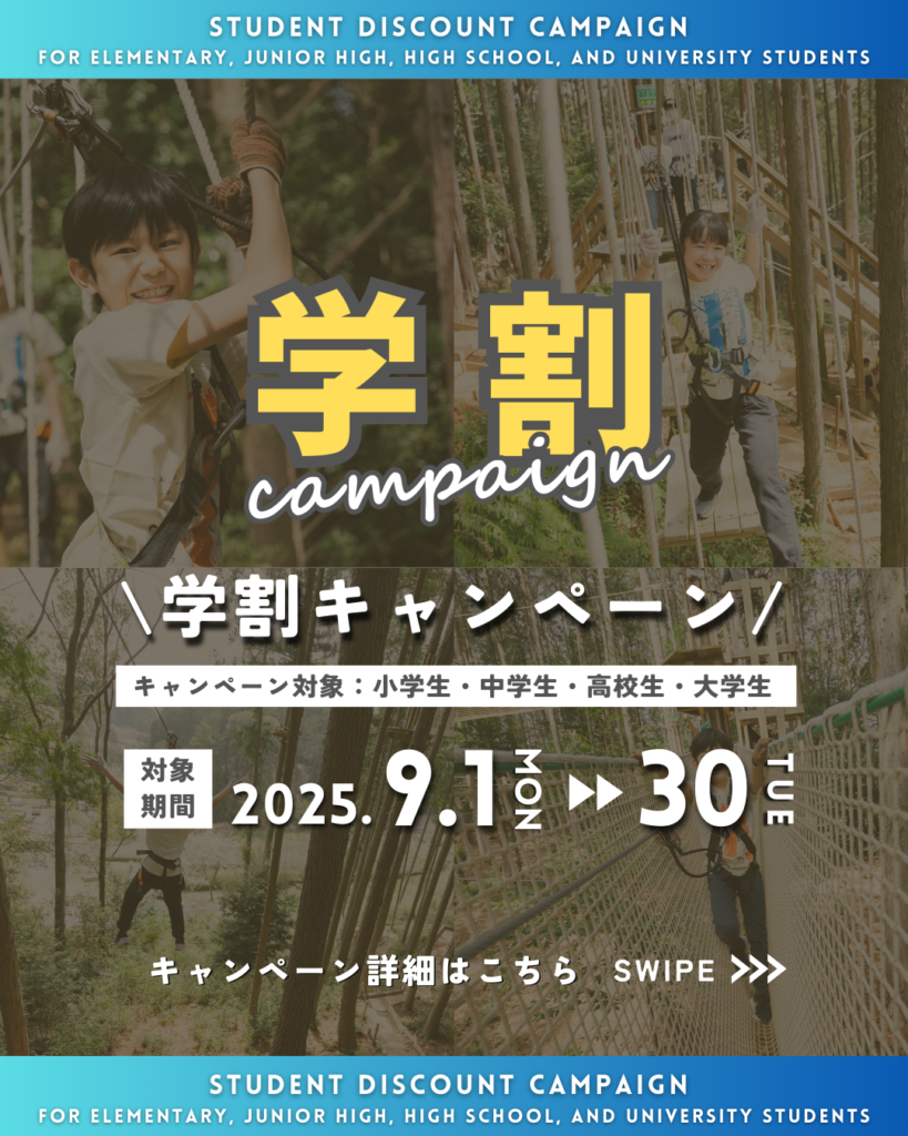 9月1日(月)〜30日(火)の1ヶ月間、フォレストアドベンチャー・新城限定で小学生・中学生・高校生・大学生の体験料金が500円OFFになる『学割キャンペーン』を実施!学生であれば誰でもお得に挑戦できる特別月間🗓️家族やクラスメート、サークルの仲間、大切な人たちと一緒なら、もっと楽しくなる冒険のチャンスをお見逃しなく!______... -
