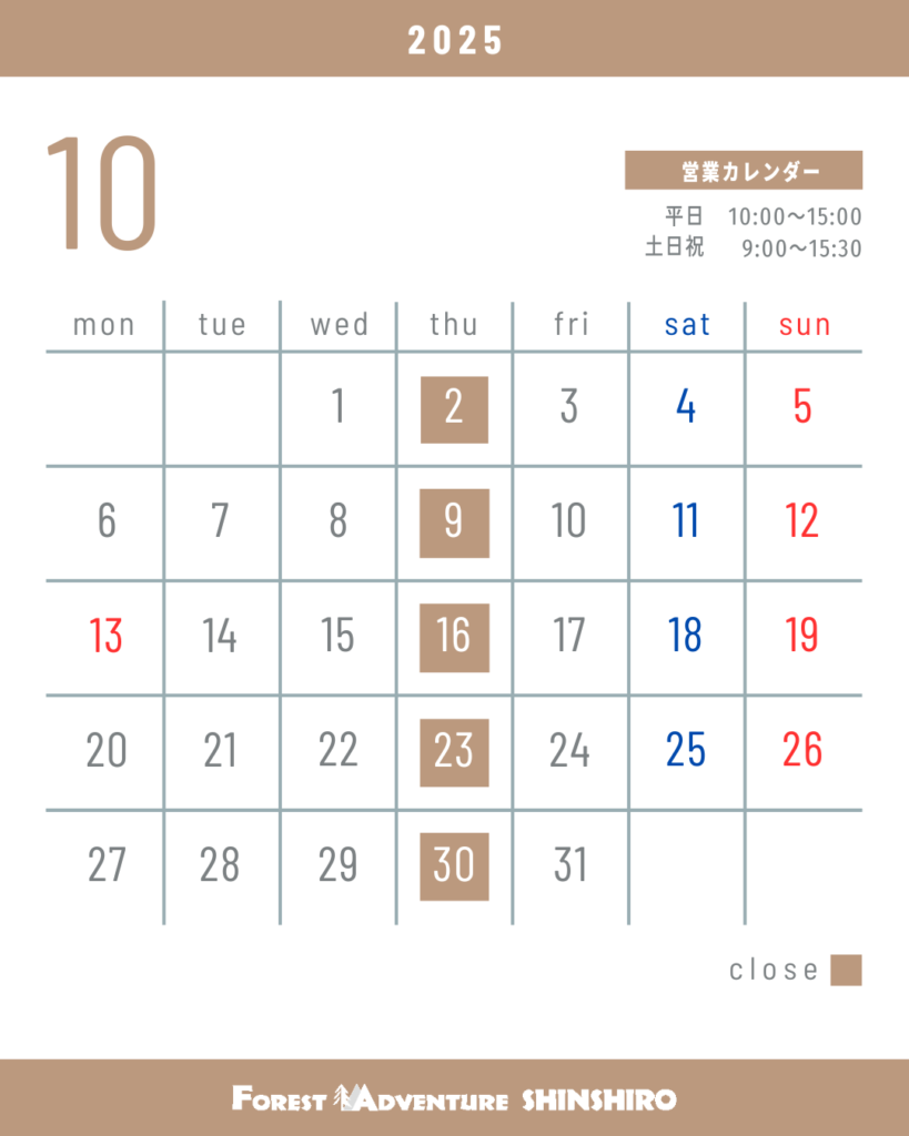 10月も毎週木曜日がクローズとなります。※天候により、急遽クローズする場合がございます。クローズの場合は、HPやSNSにてお知らせいたします。 【お問い合わせ】フォレストアドベンチャー新城Tel. 090-7033-0446 (9:00〜18:00)Mail. info@fa-shinshiro.com -