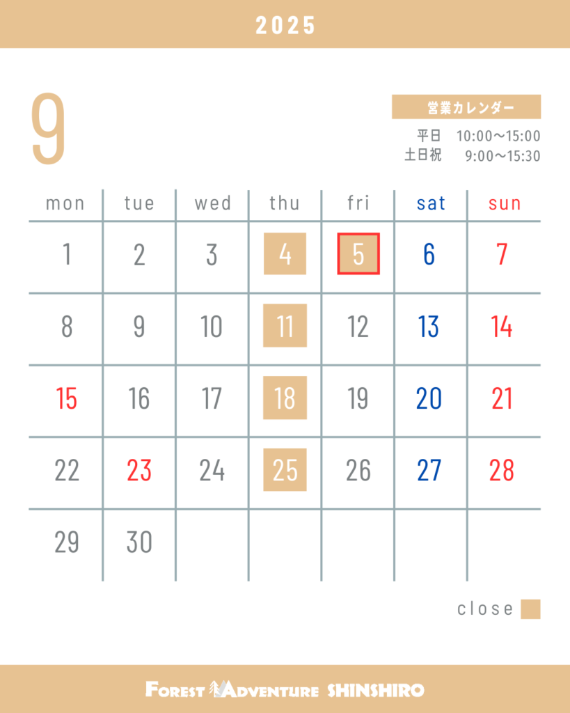 9月は木曜日がクローズとなります。※天候により、急遽クローズする場合がございます。クローズする場合は、HPやSNSにてお知らせいたします。 -