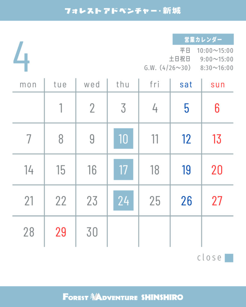 4/6(日)まで『小学生割』実施中! 3月まで3年生のお子さんも、4月ならアドベンチャーコースが体験できますよ🙆 ぜひ、この小学生割で遊びにいらしてください。 3/29(土)〜30(日)のご予約もまだまだ受付中! また、以下の日程はクローズとなります。4/10 (木)4/17 (木)4/24(木) ____________________ 【『小学... -