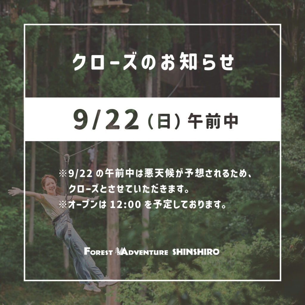 9/22(日)の午前中は悪天候が予想されるためクローズとさせていただきます。また午後よりお天気回復傾向となりますので、12:00〜オープンを予定しております。皆様のご来場お待ちしております。 フォレストアドベンチャー新城のご予約(お電話)090-7033-0446(WEB予約)https://shinshiro-fa.urkt.in/ja/direct/offices/296/courses -