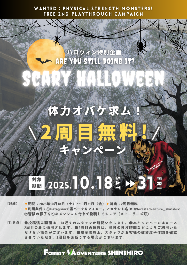 ハロウィン限定🎃『体力オバケ求ム!2周目無料キャンペーン』 期間:10/18(土)〜31(金)条件:Instagram投稿のみ! もっと遊びたい!その気持ち、全力応援💪予約不要・当日参加OKだから思い立ったらすぐできます✨ 【参加方法】👇①Instagramの当パークをフォロー(@forestadventure_shinshiro)②冒険の様子をメンション付で投稿してシェア※投... -