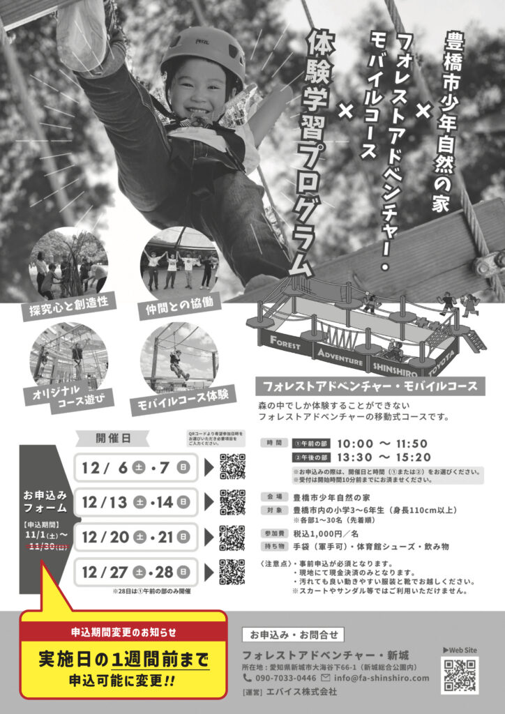 豊かな自然に囲まれた「豊橋市少年自然の家」にフォレストアドベンチャー・モバイルコースが登場! 今回は移動式アスレチック、モバイルコースを活用して小学生を対象としたチームビルディング体験プログラムを初開催します。これまで森の中で企業研修として展開してきたチームビルディングの手法を、子どもたちの“協調性”や“挑戦する力”を育... -
